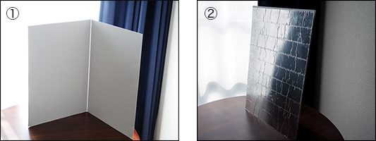 ①が厚紙ボード2枚をホワイトテープで繋いだもの。②が銀テープを一面に貼ったもの。銀の方が白よりも強く反射する。